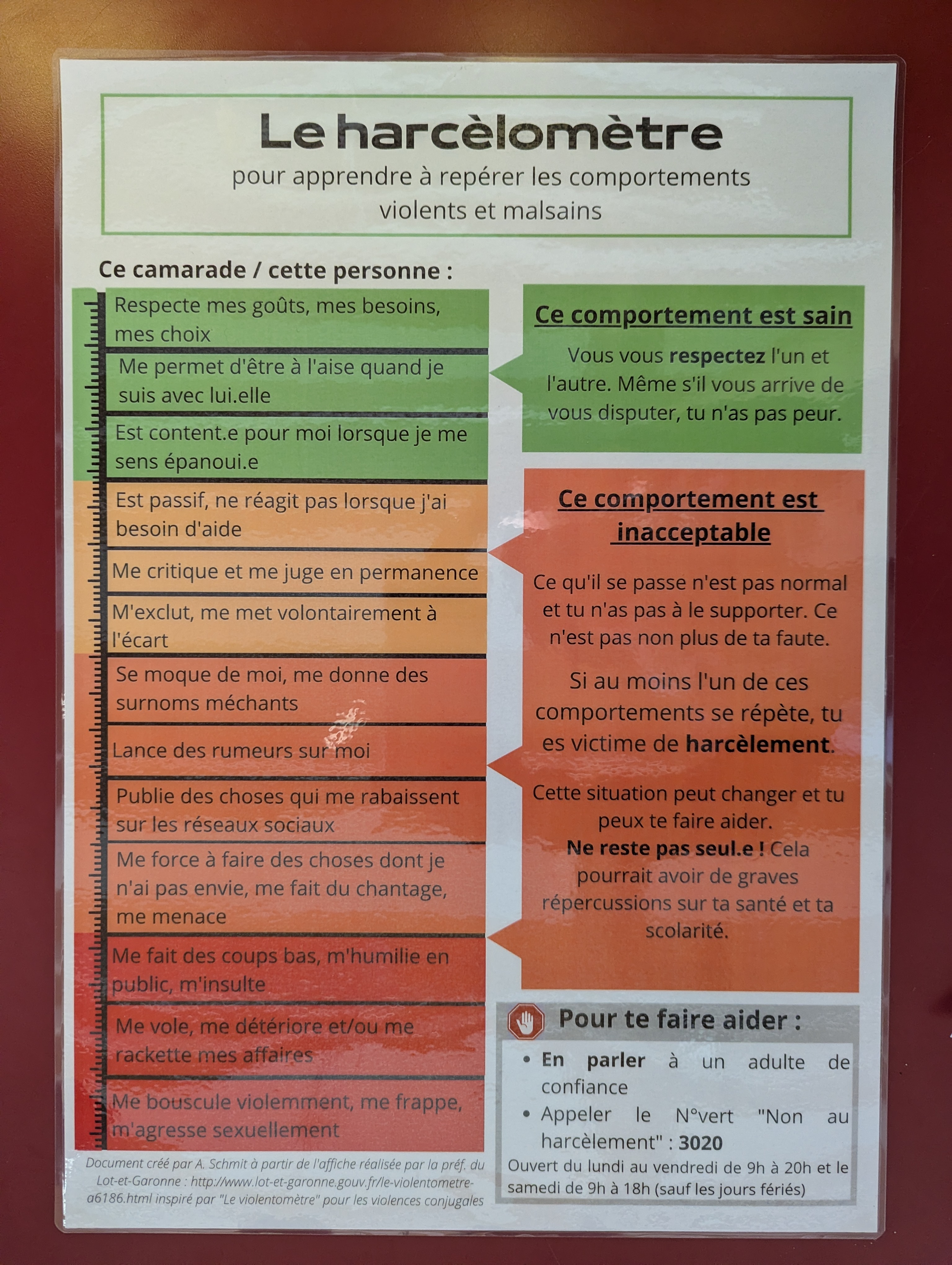 Le mardi 18 novembre, un stand d'information a été installé à la Cité Scolaire pour sensibiliser les élèves aux violences intrafamiliales. À travers des outils comme le Violentomètre, des jeux et des échanges, les élèves ont pu comprendre les signes de violence et poser leurs questions.