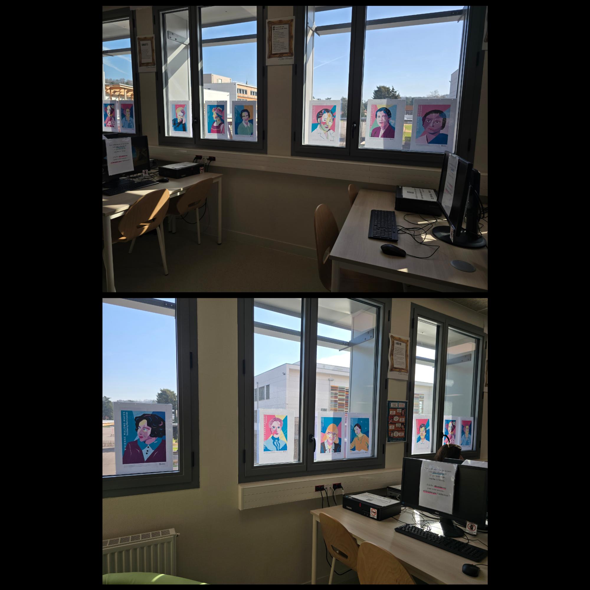 Des portraits de femmes célèbres affichés sur les fenêtres vers les ordinateurs.